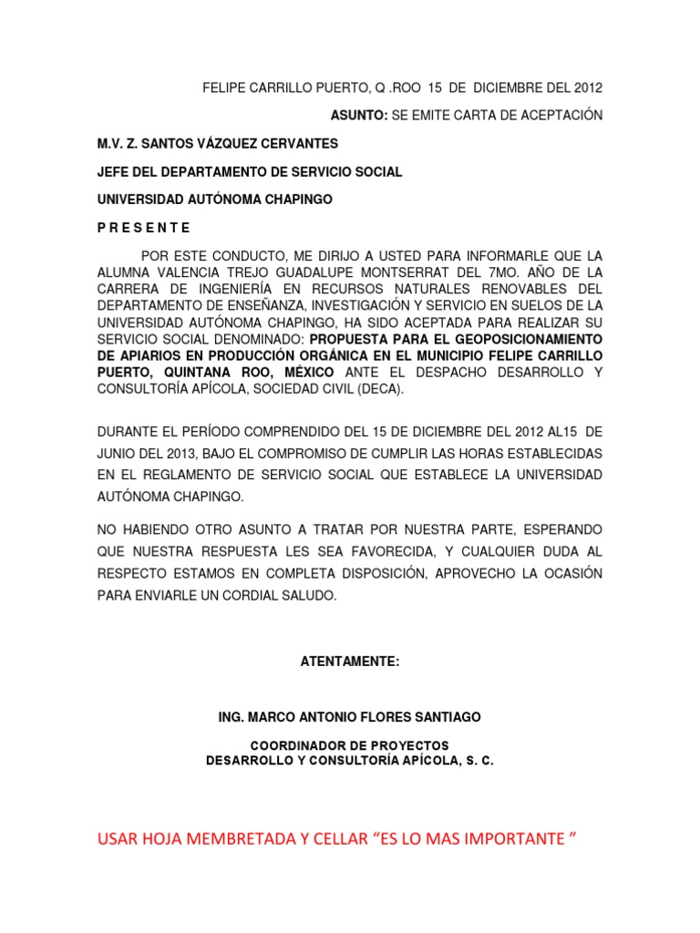 Carta De Aceptacion De Servicio Social Chapingo