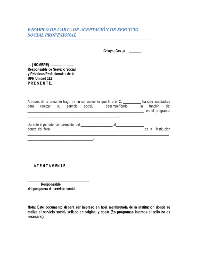Carta de aceptacion de servicio social pdf. La carta debe venir en hoja membretada y con sello de la institucion prestataria. De las unidades receptoras. Presentar la documentación que se establezca en el procedimiento correspondiente. Los formatos están en formato de microsoft word y adobe pdf.