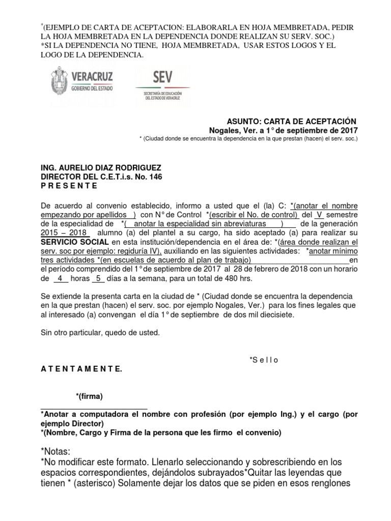 Carta de aceptacion de servicio social sep. Estimada karla andrea monroy cruz. Los formatos están en formato de microsoft word y adobe pdf. A través del área de servicio social del plantel ponemos a disposición de los alumnos los formatos requeridos para validar su servicio social en tiempo y forma. De carta de presentación le comunico que el la c.
