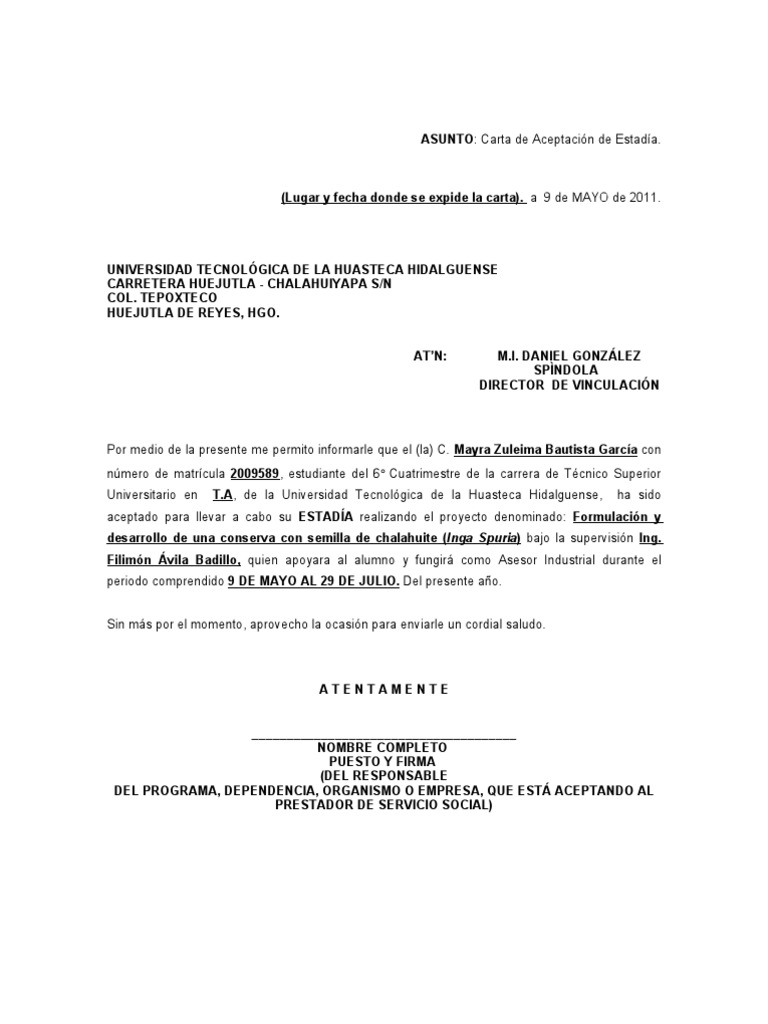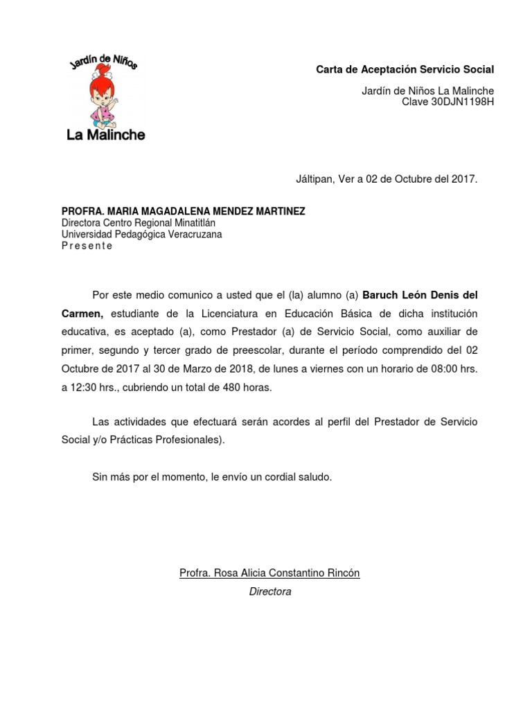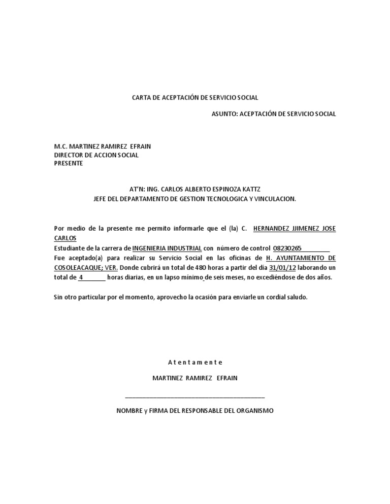 Jefe del departamento de gestión tecnológica y vinculación. Por medio de este presente hago constar que el alumno vargas rico josue adriel del tercer semestre de la carrera de mantenimiento industrial de esa institucion educativa para que apartir de la fecha 15 de septiembre de 2015 y hasta cumplir con periodo de una duracion de 480 hrs. Lo que debes saber de sobre la carta aceptación de servicio social. Carta de aceptación de servicio social.