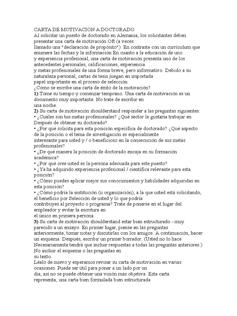 En el caso de tu interés por carta motivacion doctorado ejemplo te mostramos lo más cercano que puede ser de tu interés en nuestro de catálogo de becas. Como se dijo antes existen muchos ejemplos de cartas de motivación que varían según su finalidad y aunque exploraremos estas formas más adelante es importante conocer cuáles son los puntos básicos de cualquier redacción cuyo fin sea precisamente determinar la selección de un candidato. Tu carta de motivación para el doctorado podrá tener fines académicos pero eso no significa que no deba de respetar las reglas de una carta tradicional. Me dirijo a ustedes mediante la presente carta con objeto de explicar la motivación que me mueve para haber sido unos de los candidatos que ha solicitado la beca erasmus europea de este año 2018.