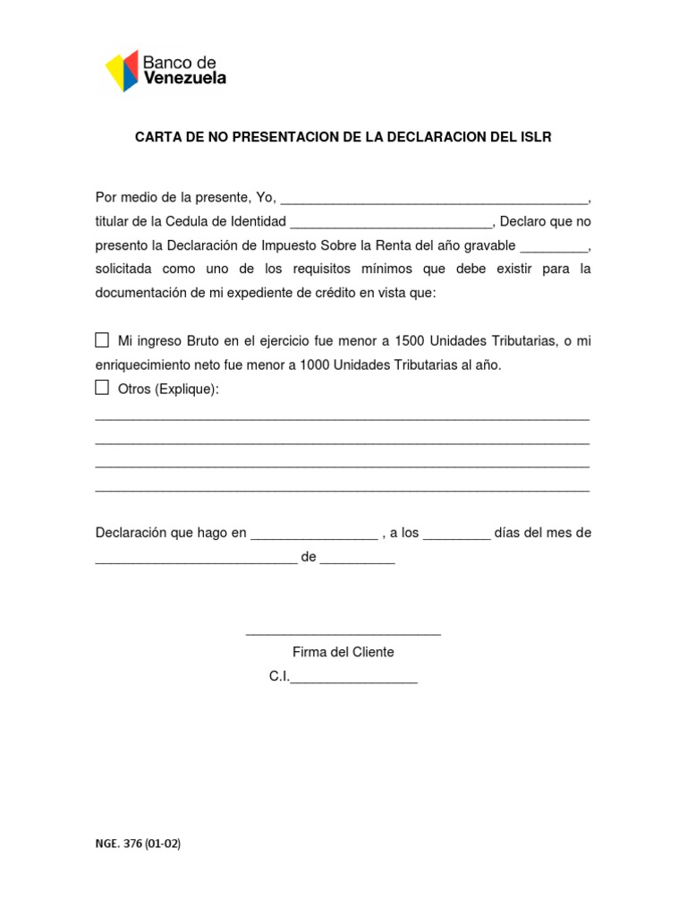 Carta de no presentacion de la declaracion islr del banco venezuela. 611 carta de no presentación de la declaración del islr aplica para aquellas empresas que no declararon islr original de referencias bancarias si las posee. Original y fotocopia de la carta de autorización de registro y código ont aplica para entes gubernamentales u organismos que reciban o. En caso de ser requerido el banco de venezuela podrá solicitar un fiador adicional quien deberá tener capacidad de pago igual o superior a la del solicitante y presentar los mismos recaudos del solicitante para el producto. Ape 503 documentos para la gestión de usuarios administradores de cl venet empresarial formulario nge 041 solicitud de descuentos de giros formulario soe 049 solicitud de carta de crédito soe 515 solicitud crediturismo nge 376 carta de no presentación islr formulario soe 601 ficha del cliente pagoenlíneabdv.