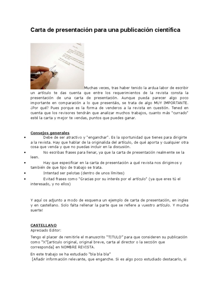 Debe de ser atractivo y enganchar. Carta de presentación para una publicación científica muchas veces tras haber tenido la ardua labor de escribir un artículo te das cuenta que entre los requerimientos de la revista consta la presentación de una carta de presentación. Además de presentar su trabajo al editor también puede aprovechar esta oportunidad para explicar por qué el manuscrito será de interés para los lectores de la revista algo que siempre está en la mente de los editores de vanguardia.