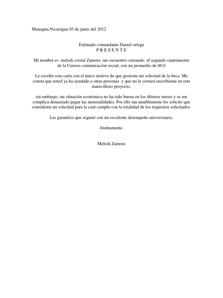 Ciudad día mes año nombre de la institución donde presentarás la solicitud para que te otorguen la beca presente. Me dirijo a usted con el fin de presentarle una solicitud para poder acceder a una beca que me ayude a comenzar los estudios en ciencias ambientales lamentablemente por mi condición económica no me es posible pagar el semestre pero siempre me he. Barcelona 12 de enero de 2020. En la actualidad la carta de recomendación laboral es un requisito casi indispensable para aplicar a una vacante.