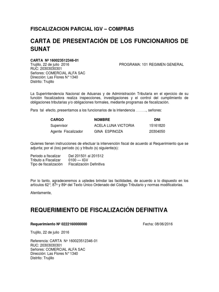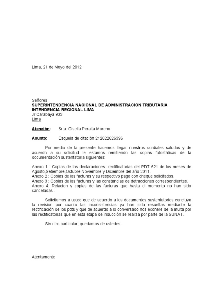 Carta de presentacion a sunat. Igual que el currículum y el sobre. Convert documents to beautiful publications and share them worldwide. Asimismo se podrá adjuntar al medio magnético una carta firmada por el director general de administración o por el funcionario que ejerza cargo equivalente de la entidad representante legal de la unidad ejecutora o entidad que presenta la información en original y copia adjuntando la constancia de información consistente coa estado para acreditar la información procesada y. Una carta dirigida ala sunat puede ser por cualquier motivo entre los más habituales son todos aquellos que tienen que ver con devoluciones o cobranzas de deudas por parte de empresas lo que viene llamándose cobranzas coactivas en las que las empresas ponen a la sunat como intermediario para el cobro y para que notifique a la empresa deudora el embargo correspondiente hasta la suma.