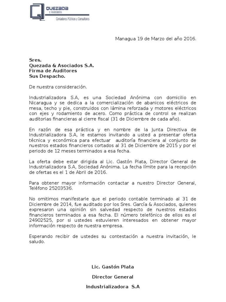 El esquema de precios deberá brindar un desglose detallado de los costos. Contabilidad auditoria y asesora residencial ftima 4ta calle len nicaragua. Reciban un cordial saludo de parte de barrios morales cia quienes esperamos se encuentren cosechando xitos en las labores. Se declara que el esquema general de nuestra oferta económica obedece a la información vertida en el cuadro siguiente.
