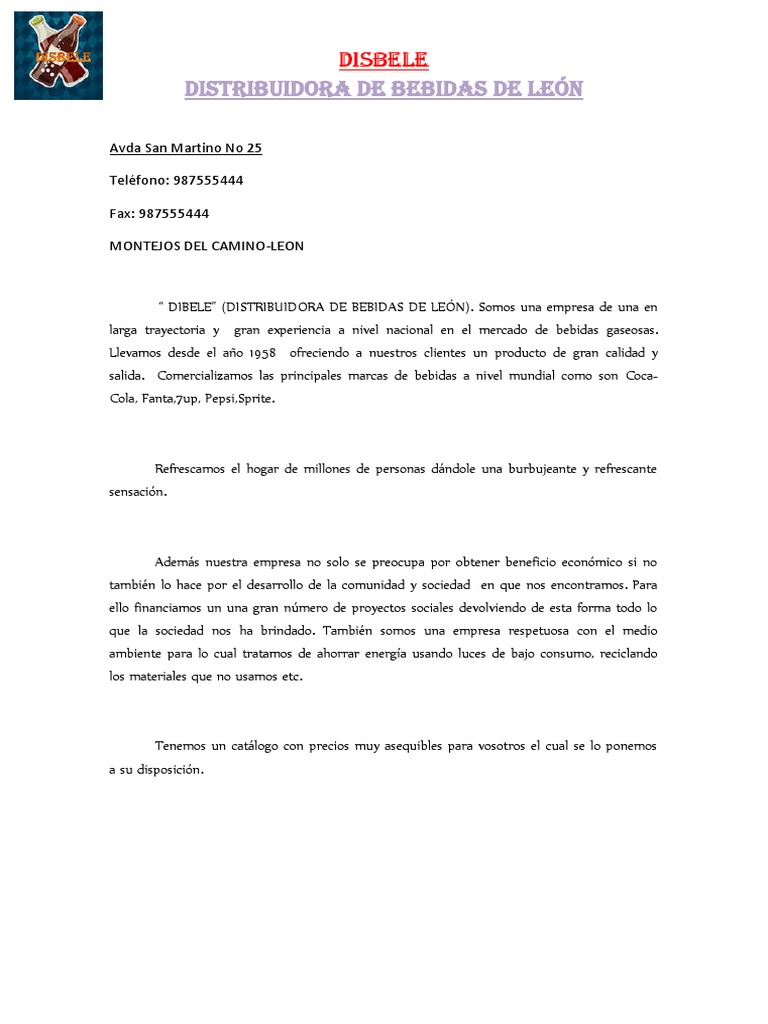 Carta de presentacion de una empresa de bebidas. El primer párrafo debe explicar el motivo de la carta es decir la presentación de la empresa. Luego de indicar quienes son la tarea que desempeñan y las ventajas de la empresa es tiempo de hablar de negocios. Una de las formas más útiles de dar a conocer tu compañía es redactando una carta de presentación de una empresa la cual tendrás que hacer llegar a todos los posibles clientes para que se conozca tu negocio y mostrar que dispone de los productos y precios que buscan las personas. Modelo de carta presentación de empresa pdf 0 1 mb etiquetas.