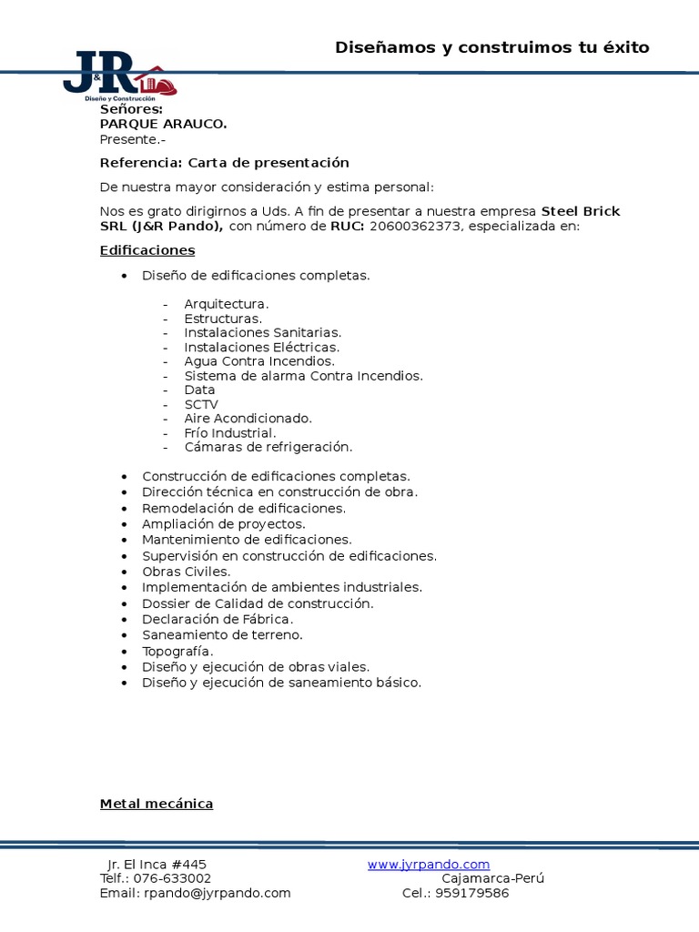 Debe notar que como en toda carta se debe iniciar con un saludo cordial. Para finalizar este artículo te presentamos a continuación un modelo de carta de presentación creado por una empresa constructora. Una de las formas más útiles de dar a conocer tu compañía es redactando una carta de presentación de una empresa la cual tendrás que hacer llegar a todos los posibles clientes para que se conozca tu negocio y mostrar que dispone de los productos y precios que buscan las personas. Mostajo rivas ingenieros sac membrete calle santa ana 234.
