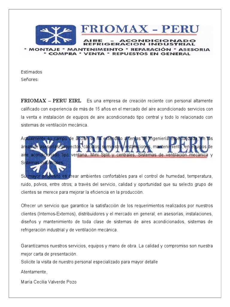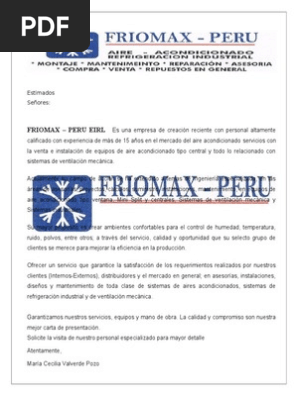 Carta de presentacion de una empresa de servicios de aire acondicionado. Cuenta con el personal altamente capacitado para la asesoría y servicio profesional en lo referente a. También enfrentaremos a empresas de la competencia y si queremos figurar dentro del mercado. Lográndose sobre la base de la seguridad y. Carta de presentación para ofrecer servicios el comienzo de un nuevo negocio nunca es algo fácil ya que nuestros futuros clientes aún no saben que existimos es por ese motivo que una de nuestras primeras prioridades es publicitar el nombre de la empresa y la marca de nuestros productos o servicios.