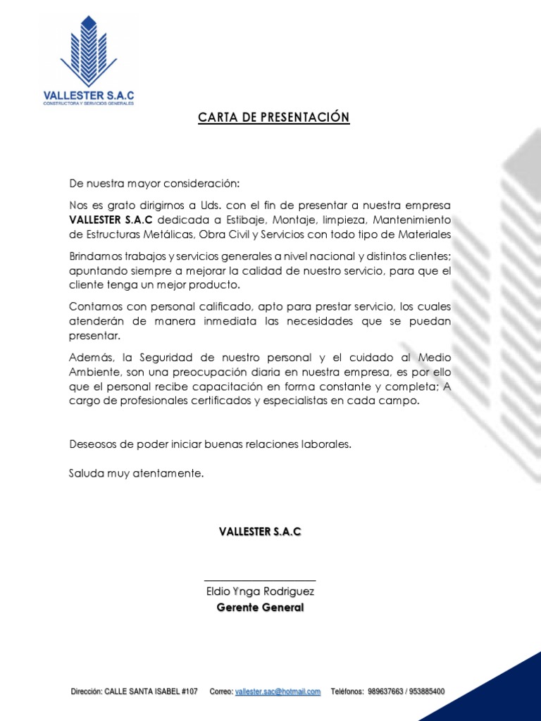 Aspectos a tomar en cuenta para redactar nuestra carta en la actualidad un gran volumen de los empleos del ámbito de limpieza se adjudica a través de empresas de servicios generales y en un gran porcentaje de casos a través de empresas de trabajo temporal. Escribe una carta con el membrete de la empresa en la que presentes a tu compañía. Carta de presentación para ofrecer servicios el comienzo de un nuevo negocio nunca es algo fácil ya que nuestros futuros clientes aún no saben que existimos es por ese motivo que una de nuestras primeras prioridades es publicitar el nombre de la empresa y la marca de nuestros productos o servicios. Arte y diseño el estilo av.