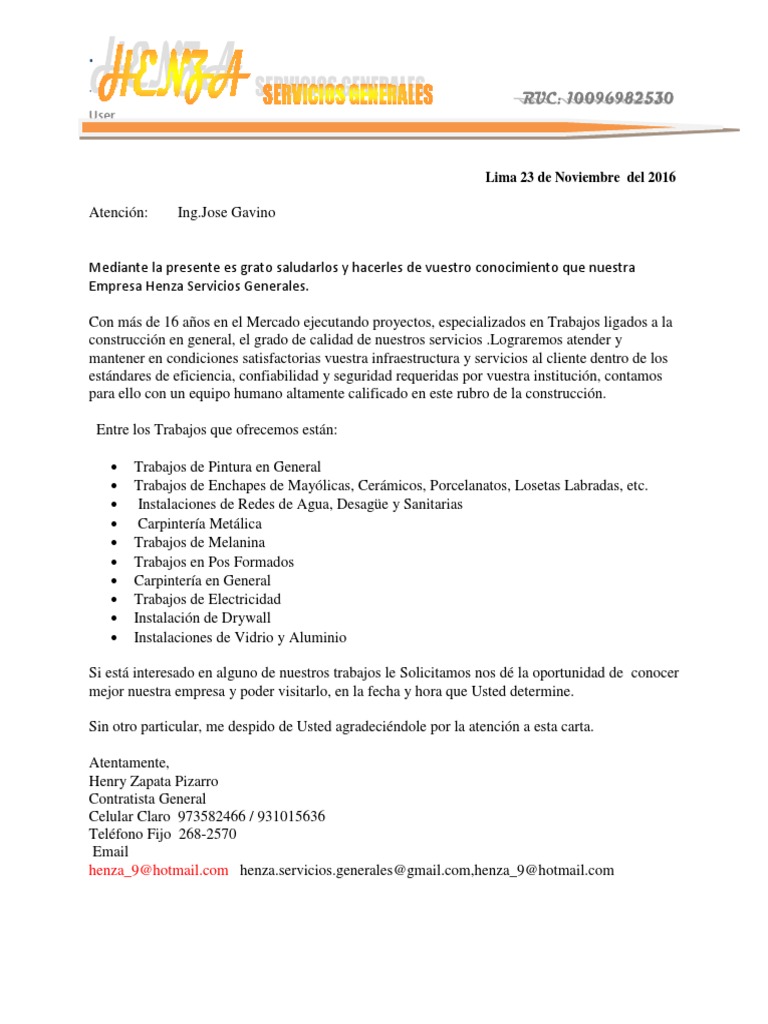 Carta de presentación para ofrecer servicios el comienzo de un nuevo negocio nunca es algo fácil ya que nuestros futuros clientes aún no saben que existimos es por ese motivo que una de nuestras primeras prioridades es publicitar el nombre de la empresa y la marca de nuestros productos o servicios. Información completa sobre modelo de carta de presentacion de empresa de servicios generales. Aspectos a tomar en cuenta para redactar nuestra carta en la actualidad un gran volumen de los empleos del ámbito de limpieza se adjudica a través de empresas de servicios generales y en un gran porcentaje de casos a través de empresas de trabajo temporal. Pintura drywall electrcidad gasfiteria mantenimiento general.