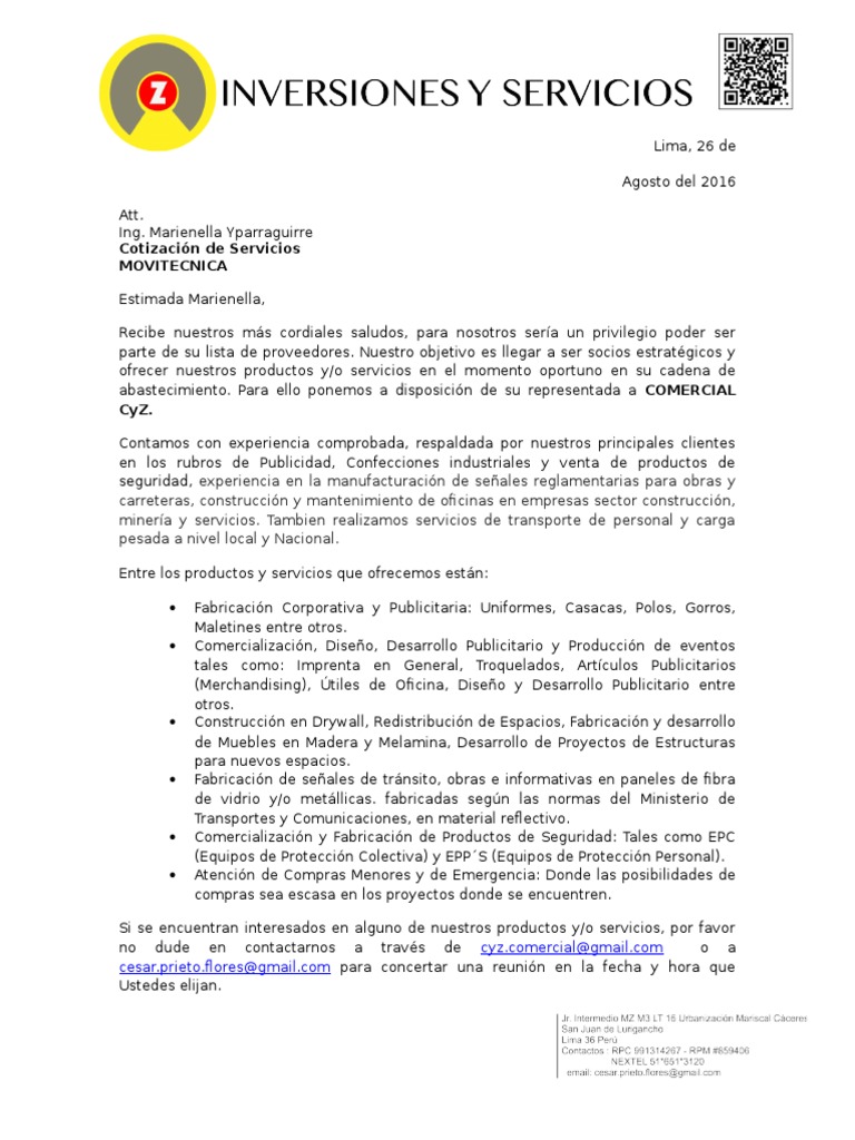 El motivo de mi carta es ponerme a su disposición y ofrecerles mis servicios si fueran de su interés en estos momentos o en el futuro. Publicaciã n en medios de comunicaciã n diarios. â como profesionistas o representante de un negocio. Descargar cartas de presentación de servicios de empresa en word.