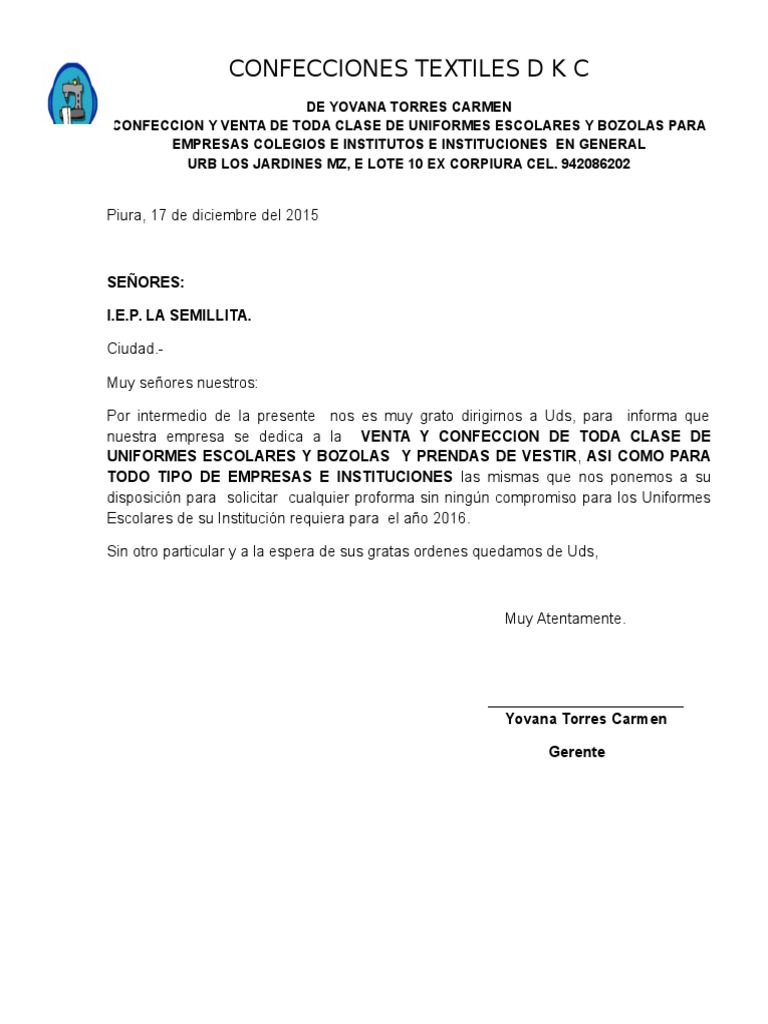 Nombre y razón social de la empresa que recibe la carta presente reciban un saludo cordial de parte de nombre y razón social de la empresa que se presenta empresa que nace con la intención de revolucionar el ramo de ramo comercial al cual pertenece la empresa que se presenta mediante la incorporación de recursos humanos y. Es necesario saber diferenciarse de la competencia y una de las maneras de lograrlo es saber promocionar los servicios de nuestra empresa de la manera adecuada. Nosotros corporacion textil del peru r m es una empresa enfocada a elevar la imagen personal y profesional de su empresa organización y o colegio teniendo como ejes de trabajo el desarrollo de prendas y accesorios textiles con altos estándares de calidad en su confección. Gustavo basto departamento de compras.