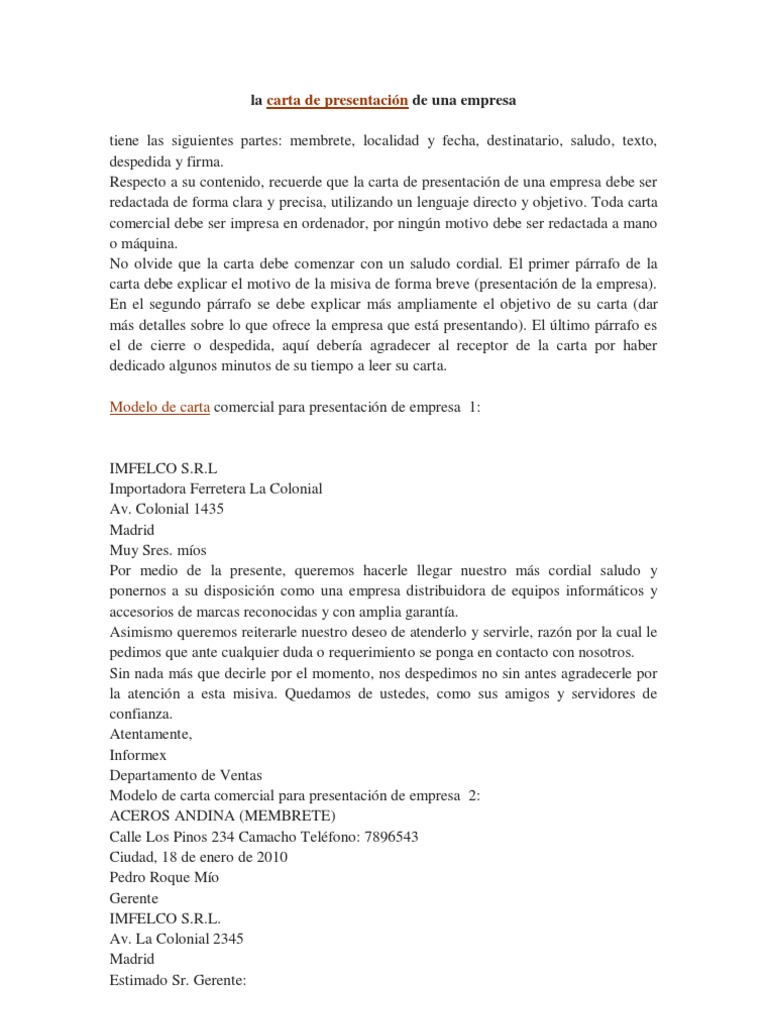 Gratis te ofrecemos los mejores ejemplos de carta de presentación de una empresa distribuidora. Se trata de cartas que emiten las empresas con el fin de darse a conocer y mostrarles a los clientes o posibles clientes los servicios que ofrece y el trabajo al que se dedican. Una de las formas más útiles de dar a conocer tu compañía es redactando una carta de presentación de una empresa la cual tendrás que hacer llegar a todos los posibles clientes para que se conozca tu negocio y mostrar que dispone de los productos y precios que buscan las personas. Modelo de carta presentación de empresa pdf 0 1 mb etiquetas.