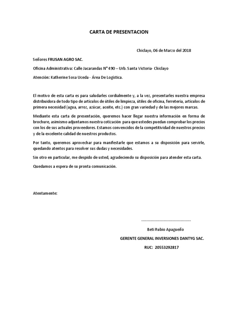 Una de las formas más útiles de dar a conocer tu compañía es redactando una carta de presentación de una empresa la cual tendrás que hacer llegar a todos los posibles clientes para que se conozca tu negocio y mostrar que dispone de los productos y precios que buscan las personas. Se trata de cartas que emiten las empresas con el fin de darse a conocer y mostrarles a los clientes o posibles clientes los servicios que ofrece y el trabajo al que se dedican. Son las que se envían para presentarse a una empresa sin necesidad de que haya una oferta de puesto vacante sobre la mesa. Hay una competencia feroz y debe destacarse.