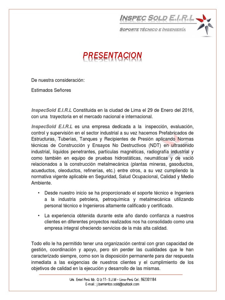 El primer párrafo debe explicar el motivo de la carta es decir la presentación de la empresa. Viernes 20 de abril de 2012. Es una empresa fundada en 1998 con el afán de participar en el desarrollo de la industria nacional apoyando a gran numero de empresas nacionales e internacionales en sus proyectos de construcción y mantenimiento especialmente en el suministro de instrumentos de medición y control de fluidos. Esta carta de presentación es muy importante para una empresa ya que ella da una muestra de lo que ellos pueden y tienen.