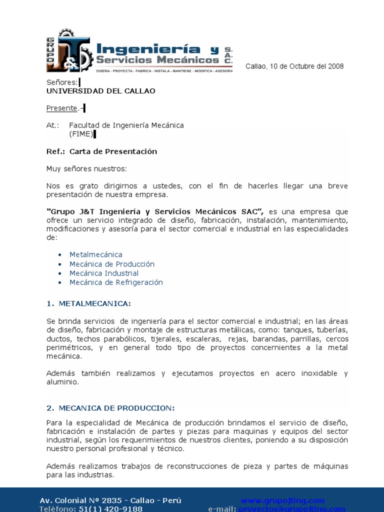 Nuestro objetivo es brindar el asesoramiento necesario y adecuado a cada una de sus necesidades en el campo de la. Industria metalmecanica carrasco e i r l. Así que antes de comenzar a escribir una carta de presentación de una empresa ofreciendo sus servicios tienes que tener la mentalidad correcta. Una de las formas más útiles de dar a conocer tu compañía es redactando una carta de presentación de una empresa la cual tendrás que hacer llegar a todos los posibles clientes para que se conozca tu negocio y mostrar que dispone de los productos y precios que buscan las personas.
