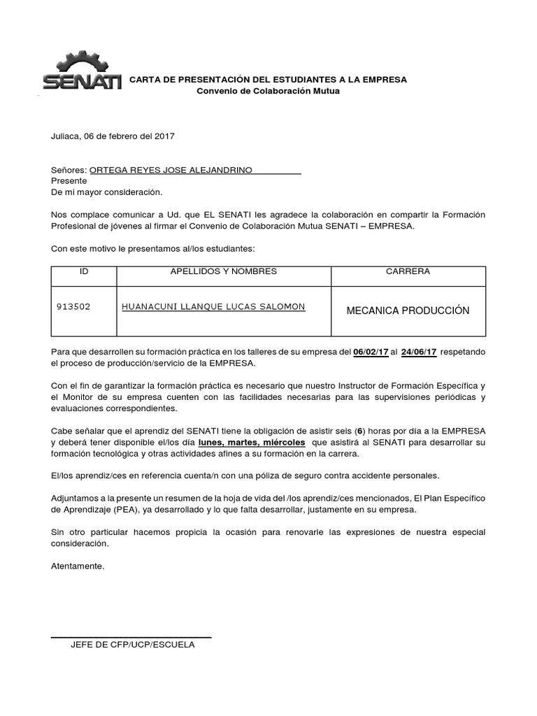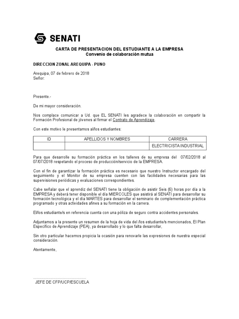 El motivo de mi carta es ponerme a su disposición y ofrecerles mis servicios si fueran de su interés en estos momentos o en el futuro. Nombre de la empresa dirección fecha. Nombre y razón social de la empresa que recibe la carta presente reciban un saludo cordial de parte de nombre y razón social de la empresa que se presenta empresa que nace con la intención de revolucionar el ramo de ramo comercial al cual pertenece la empresa que se presenta mediante la incorporación de recursos humanos y. Convenio de colaboracin mutua senati empresa para la formacion de tcnicos direccin zonal.