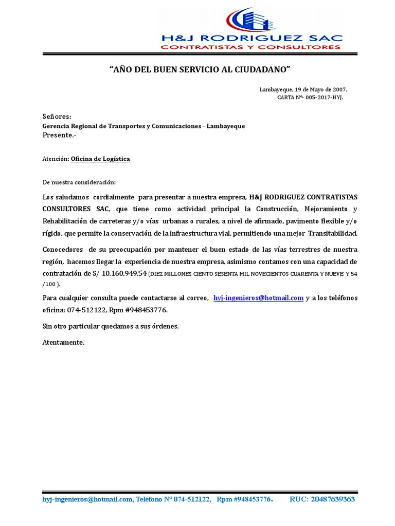 Carta de presentacion empresa contratista. Carta de presentacion mostajo rivas ingenieros sac de nuestra mayor consideración y estima. Para enviarle nuestra carta de presentación con el fin de presentar a nuestra empresa mostajo rivas ingenieros s a c especializada en ingeniería construcción supervisión y gerencia de proyectos. Una de las formas más útiles de dar a conocer tu compañía es redactando una carta de presentación de una empresa la cual tendrás que hacer llegar a todos los posibles clientes para que se conozca tu negocio y mostrar que dispone de los productos y precios que buscan las personas. Nombre de la empresa dirección fecha.