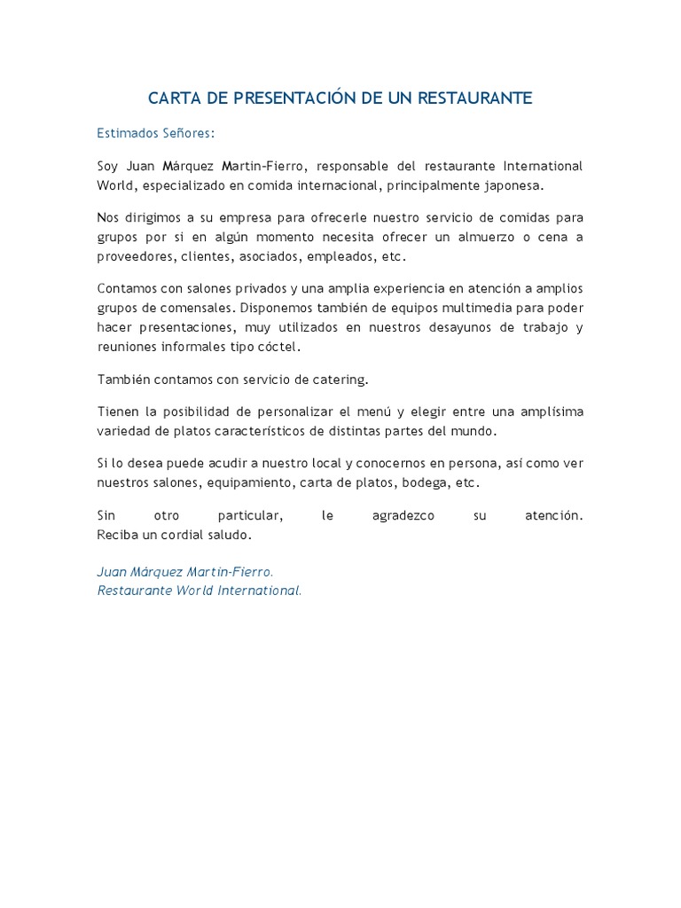 Pertenecer al equipo de una empresa que me permita alcanzar mis objetivos de crecimiento profesional. En esta sección te traemos dos ejemplos de nota para dar a conocer un restaurante. La carta de presentación es un documento que acompaña y complementa tu currículum vitae y te ofrece la posibilidad de presentarte ante la empresa aumentando exponencialmente las probabilidades de que el reclutador se interese más por ti y te llame para hacer una entrevista de trabajo. Si necesitamos presentar un restaurante a distintas empresas para ofrecer servicios de comidas para grupos catering eventos etc podemos utilizar una carta como la que os proponemos.