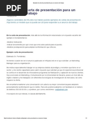 Redactar una buena carta de presentación es uno de los pasos más importantes a la hora de conseguir un nuevo empleo. Tras leer su anuncio ofertando un empleo el pasado día 10 del presente mes en el portal de infojobs me dirijo a ud. Las cartas de presentación de infojobs sólo son visibles a la empresa si tú decides incluirla al inscribirte en una oferta de infojobs pero no es visible si la empresa te busca en la bbdd o si sólo te inscribes con el cv. Esperamos que tu próxima carta de presentación tenga el efecto deseado y que no necesites hacer otra en mucho tiempo.