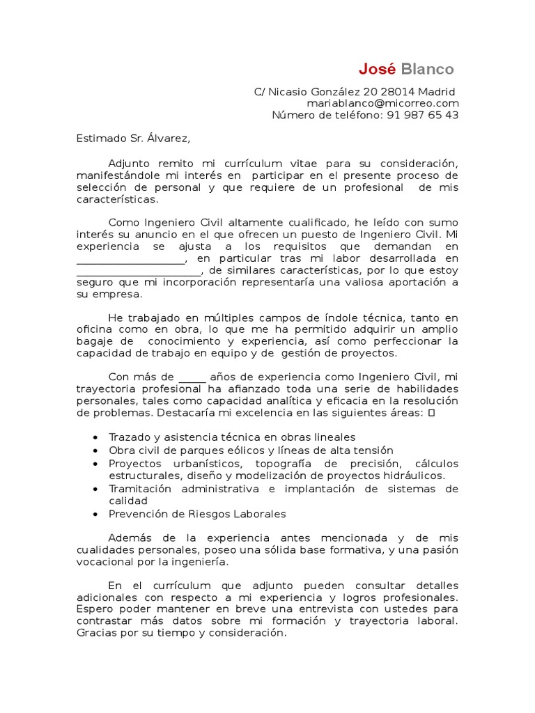 Carta de presentacion laboral ingeniero civil. Modelo de carta de presentación para ingenieros 1. 91 987 65 43 estimado sr. Carta de presentación héctor arcos ingeniero civil estimado sra sr. El objetivo de una carta de presentación para ingeniero civil es convencer a la empresa empleador o entrevistador de recursos humanos que vale la pena que nos convoquen a una entrevista laboral.