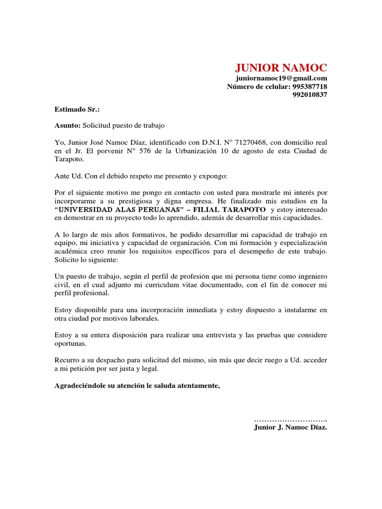 Como ingeniero civil altamente cualificado he ledo con sumo inters su. Reciba un cordial saludo. Oficina de recursos humanos av. Industrial no 830 teléfono 2054078.