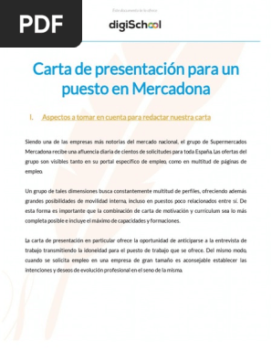 Carta de presentacion mercadona pdf. No repitas la información que ya se encuentra plasmada en el currículum. Vicerrectorado de alumnos de la universidad politécnica de madrid paseo juan xiii 11 28040 madrid coie practicas upm es coie empleo upm es una vez que tengas listo todo lo anterior estás preparado para comenzar tu redacción. Una buena carta de presentación es un documento muy importante para conseguir un trabajo en un supermercado en esta página encontrarás un ejemplo que te puede resultar útil si estás buscando un empleo como cajero o reponedor. Las cartas de presentación son tu mejor opción.