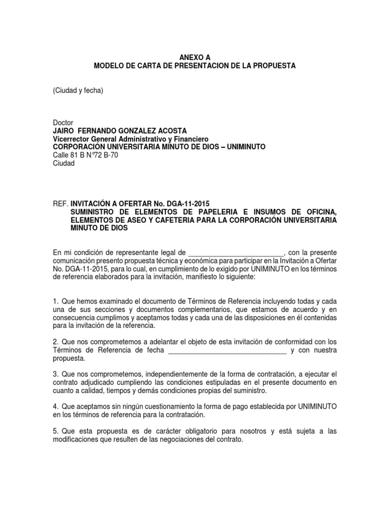 Luego de haber examinado el pliego de condiciones incluyendo sus enmiendas n el proponente debe insertar los números de las enmiendas que hubiese. Licitación pública n indicar el nombre de la licitación estimados señores. La presente tiene por objeto presentar propuesta para la licitación de la referencia cuyo objeto es de acuerdo con los términos y condiciones previstos en los pliegos de condiciones de la licitación. 56 16 56 encontró este documento útil 16 votos 43k vistas.
