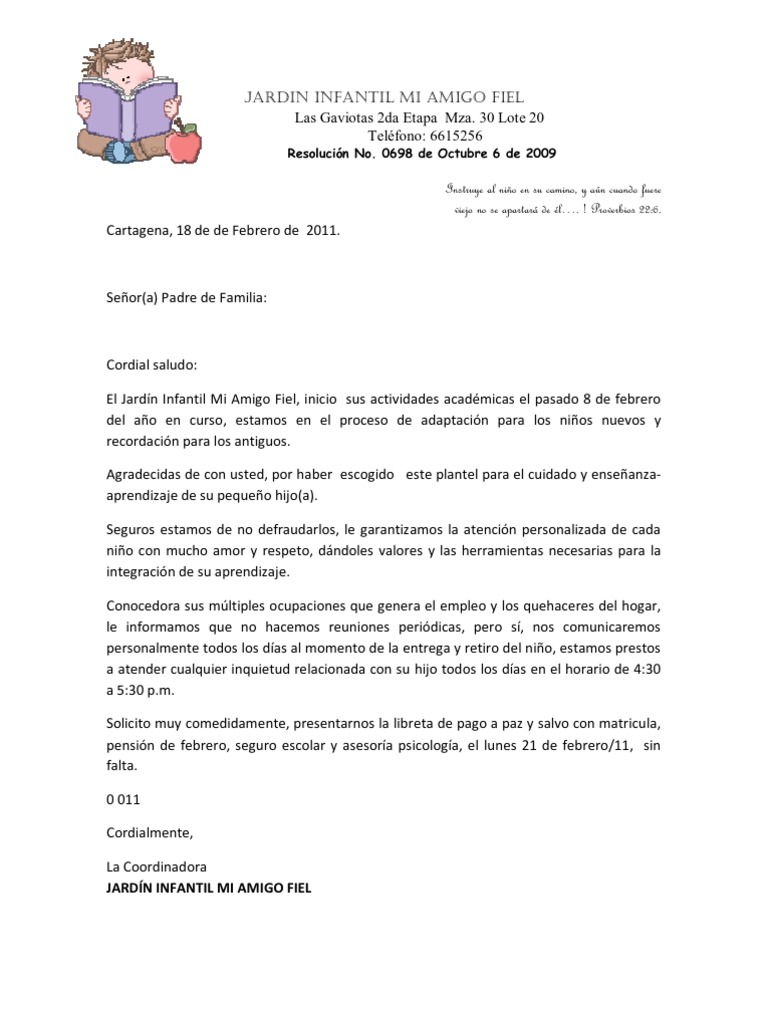 Carta de presentacion para jardin infantil. Sala cuna y jardín infantil sagrada familia el centro de educación de la infancia sagrada familia de la universidad católica de la santísima concepción que opera en el sector de palomares llama a concurso para proveer el cargo de asistente técnico educación de párvulos jornada 45 horas. Para nuestra desgracia desde ese momento los problemas empezaron a surgir en la primera semana mordieron de forma grotesca a mi hijo ian arrancándole un pedazo de carne de la mano llegó a la casa sin ninguna curación y al papá le comentaron que ese mordisco había sido del hermano siendo que la boca era de un niño mucho mayor lo. El jardín infantil mi amigo fiel inicio sus actividades académicas el pasado 8 de febrero del año en curso estamos en el proceso de adaptación para los niños nuevos y recordación para los antiguos. Transmitirles con firmeza y con cariño tantos buenos conocimientos y decirles que valoramos el esfuerzo que han hecho para formarles de la mejor manera.