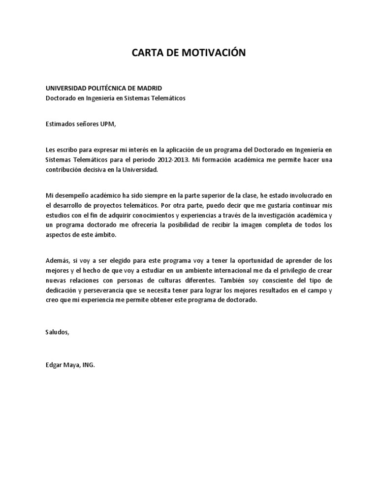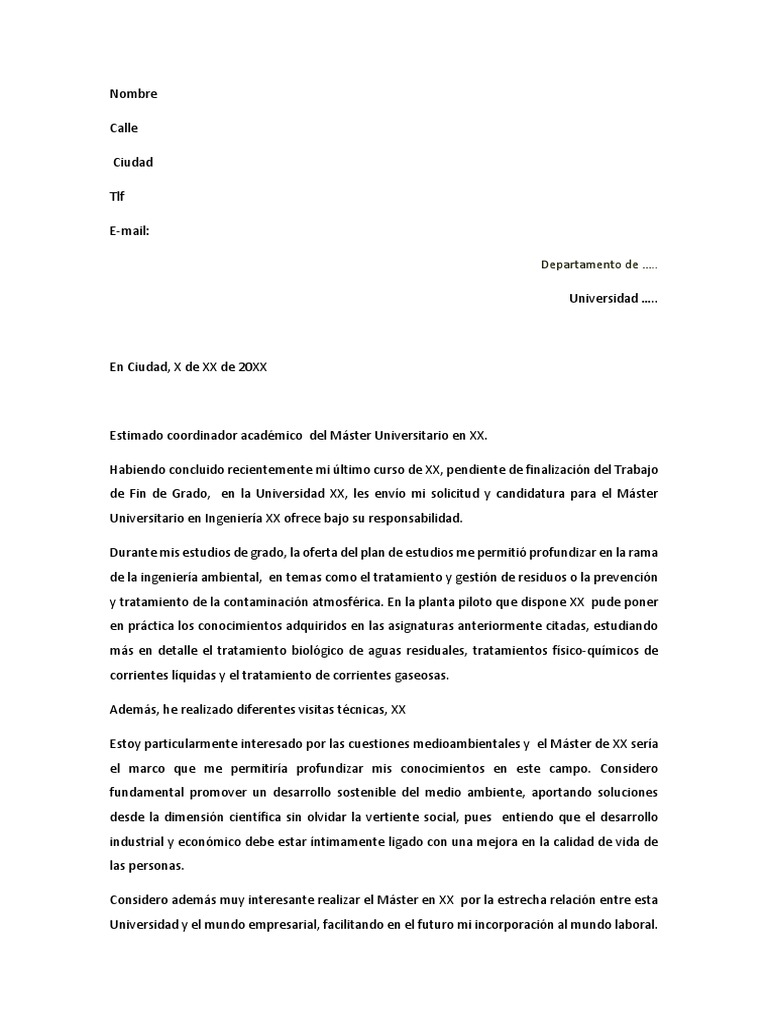 Las cartas de recomendación son consideradas documentos los cuales son escritos por una persona escuela o empresa y van dirigidos al comité académico del programa de estudio elegido. Con la intención de ayudaros a conseguir que os acepten en el máster que quieres cursar os ofrecemos esta carta de motivación para estudiar un máster. Tamaño de fuente entre 10 y 12 puntos. Esta debe explicar las razones que tiene para querer estudiar el.