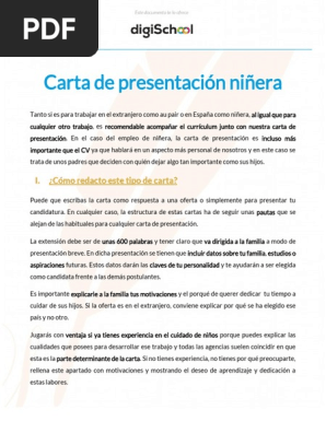 Tanto dentro de españa como en el extranjero el mundo laboral ha hecho que cada vez más padres necesiten de estos servicios. Carta de presentación para un empleo de niñera. Babysitter de confianza y con cartas de recomendación se ofrece para cuidar niños por las noches y fines de semana. En apenas un folio se debe recoger el.