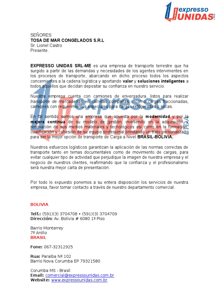 Las empresas pueden ofrecer dos tipos de cosas. Carta de presentacion para ofrecer servicios de transporte de carga información completa. Desde 2005 el equipo de asesores profesionales redactores de cv certificados y tecnólogos expertos de livecareer ha estado desarrollando herramientas profesionales que han ayudado a más de 10 millones de usuarios a crear cv más eficaces a redactar cartas de presentación más convincentes y a desarrollar mejores aptitudes para las entrevistas. Una carta de presentación de servicios es una carta enfocada a informar a los clientes potenciales las capacidades que tiene una empresa para prestar los servicios correspondientes a su giro.