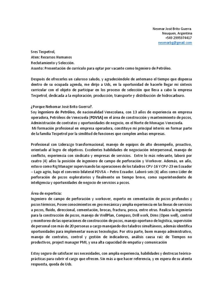 Carta de presentacion para una empresa petrolera. La carta de presentación de una empresa es un documento formal que como su nombre lo indica las empresas lo emiten para indicar cuáles son los servicios que tienen disponibles y que así sus posibles clientes conozcan un poco más acerca de ellas muchas veces una compañía las manda como parte de su cv empresarial para que así tenga un toque más profesional en lo que se envía. Cómo hacer una carta de presentación para una empresa. Sinceramente es la primera vez que voy a redactar una carta para un puesto vacante. En los siguientes ítems te damos algunas sugerencias para redactar de forma.
