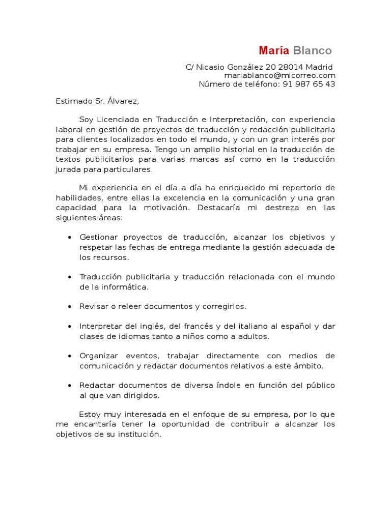 Respuesta a un anuncio. La carta de presentación indicará en qué parte del expediente de solicitud figura la información que contempla el punto 7. Vanesa vergara c de la pluma 13 2º 28032 madrid tlf. Director de publicaciones habiendo tenido noticia de la oferta de empleo de traductor independiente freelance que su editorial nuevas ediciones ha emitido le remito la presente carta al estar muy interesada en dicho puesto para el que me considero muy capacitada por cuanto.