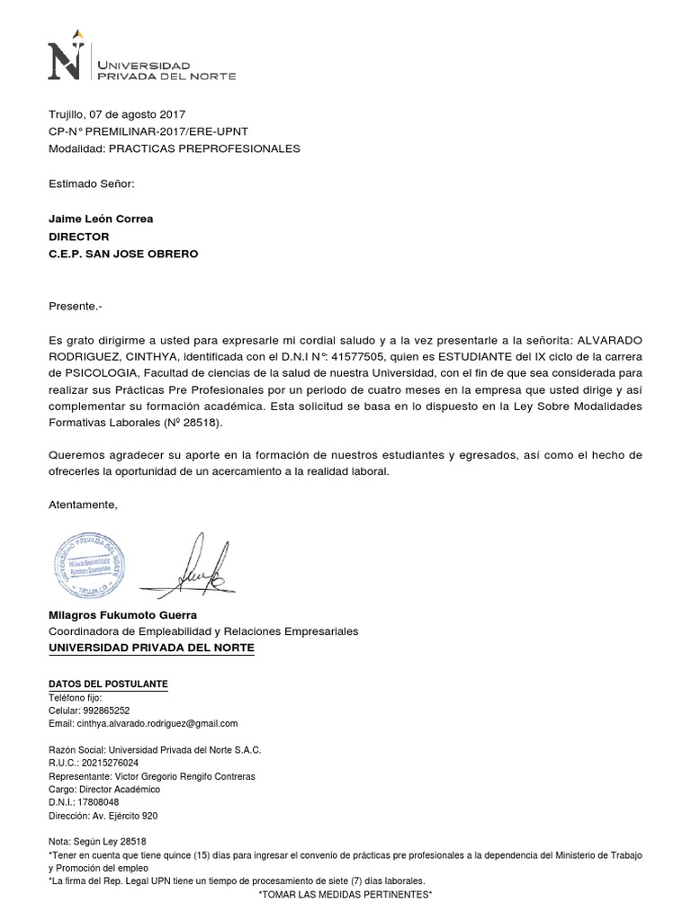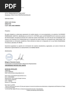 Este modelo de carta es totalmente personalizable puedes incluir tus datos perosonales e intereses inspirándote en el texto de ejemplo que te ofrecemos. Por lo mismo hay diferentes tipos. Podrás realizar dicha solicitud siempre y cuando las actividades a realizar dentro de la institución u organización no sean remuneradas o en cualquier caso no se formalicen a través de un convenio de práctica pre profesional. Accede a mi mundo upn después solicitudes luego carta de presentación y rellena la carta con tus datos y los de la empresa a la que quieres ser presentado.