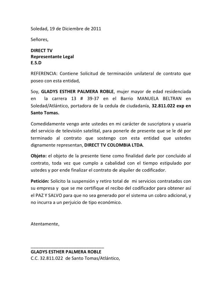 Así se usa una carta de cancelación de servicios cuando se tiene contratado un servicio con una empresa o se tiene el servicio de una institución y por razón unilateral se toma la decisión de cancelar el servicio completo o alguno de los servicios de los que se prestan. Carta de desistimiento de arrendamiento. Una carta de presentación de servicios es una carta enfocada a informar a los clientes potenciales las capacidades que tiene una empresa para prestar los servicios correspondientes a su giro. Contiene solicitud de terminacin unilateral de contrato que poseo con esta entidad soy gladys esther palmera roble mujer mayor de edad residenciada en la carrera 13 39 37 en el barrio manuela beltran en soledad atlntico portadora de la cedula de ciudadana 32 811 022 exp en santo tomas.