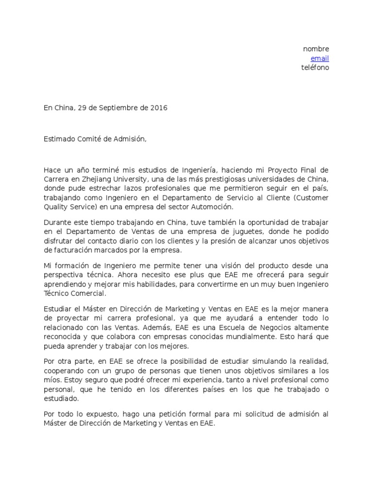 Es una formalidad muy personal la cual sirve como tu presentación pasando a ser el primer filtro en el proceso de tu selección y posterior ingreso a la. Márgenes de 2 5 cm. Si bien es cierto que la política de una carta de motivación es que sea un documento personal la gran mayoría de las cartas se guían por. Las cartas de motivación de máster son un documento que se pide en algunas universidades y escuelas de negocios en las que el.