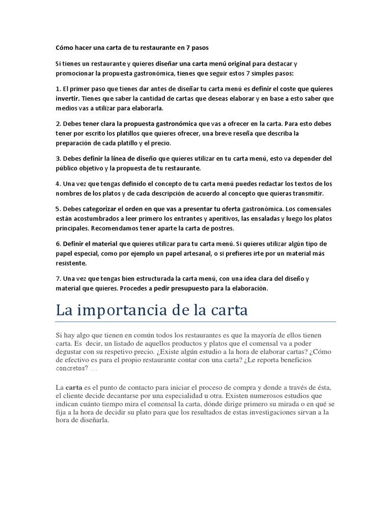 En reprotel contamos con numerosos recursos técnicos y materiales para convertir la carta de tu restaurante en un elemento clave para que los clientes comiencen su experiencia de la. La premisa número uno para elaborar un menú es la sencillez. Ideal para los restaurantes de estilo clásico. Una carta de presentación de un restaurante dirigida a empresas de la zona podría ser la siguiente.