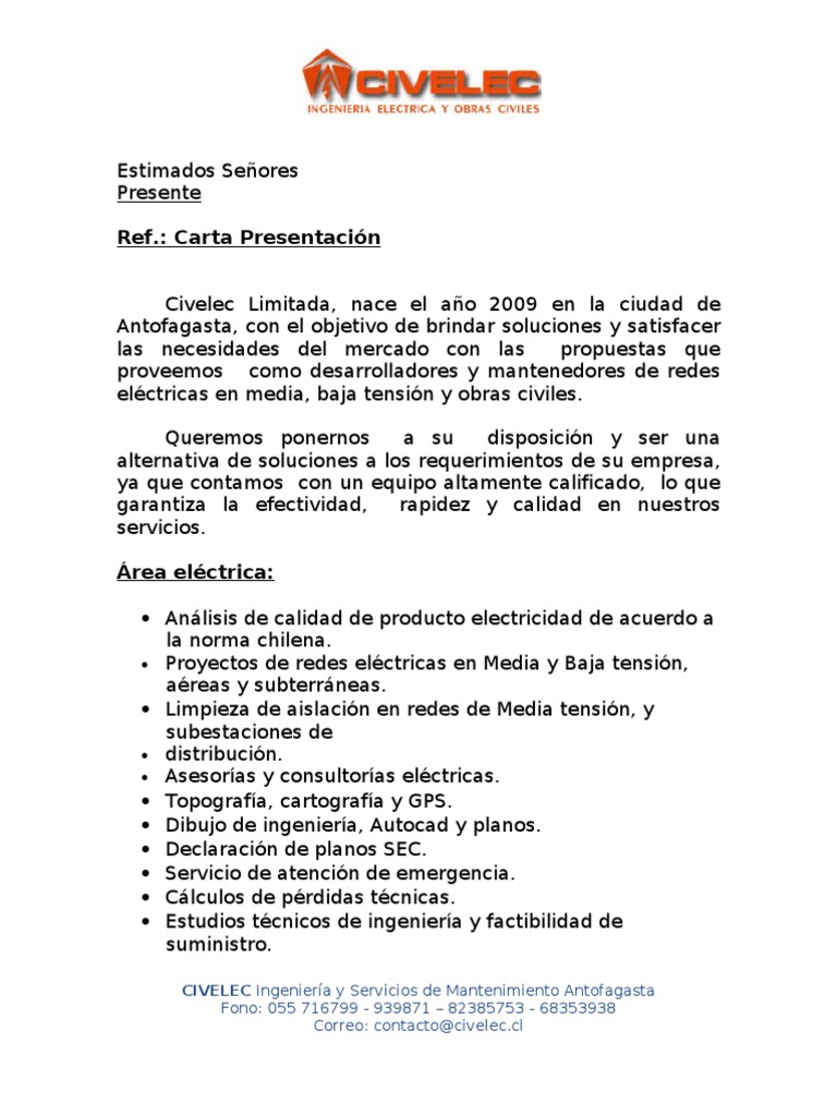 Carta presentacion empresa ingenieria electrica. Asesoramos a tu empresa para obtener una solución personalizada que mejor se adapte a tus necesidades buscando en caso necesario fórmulas de financiación para su implantación. La empresa capacita permanentemente a su personal sobre normas de seguridad en los trabajos de naturaleza eléctrica. Presentación de la empresa ingeniería civil y construcción de obras iccosa es una compañía constructora con sede en la ciudad de guadalajara jalisco méxico. Cotizacion cctv winner 797.