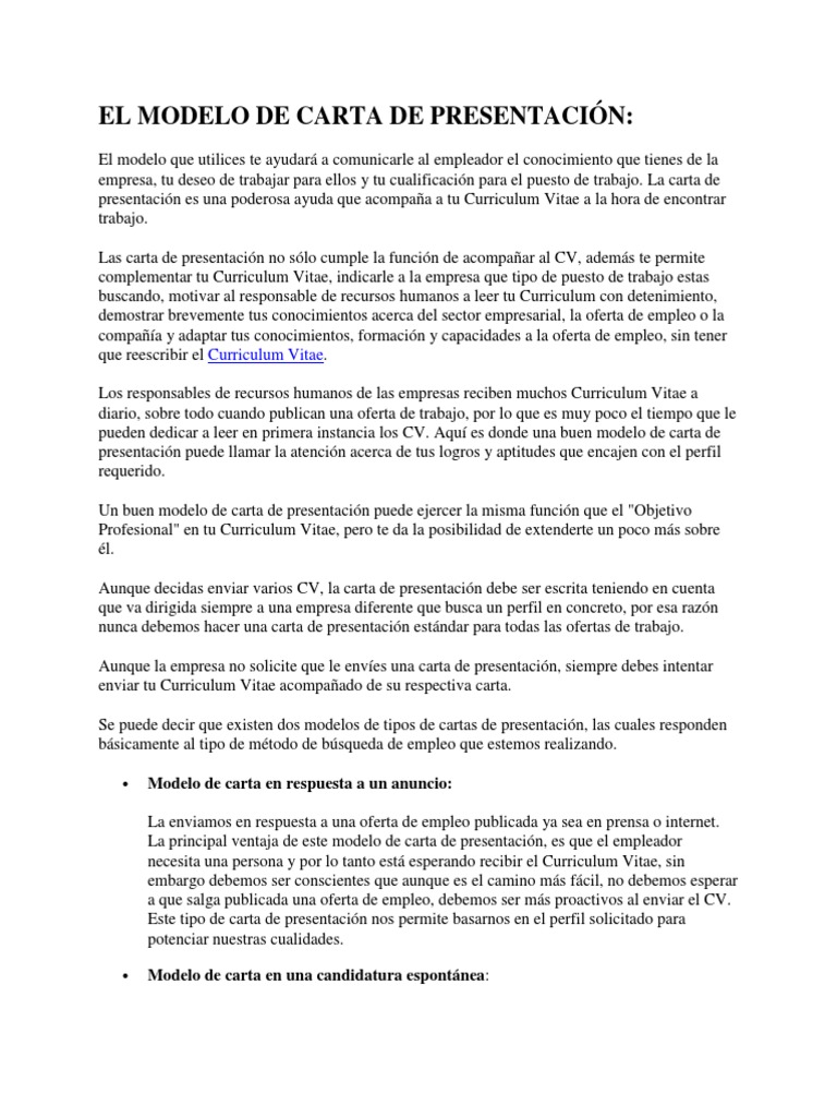 La carta de presentación es un documento que acompaña y complementa tu currículum vitae y te ofrece la posibilidad de presentarte ante la empresa aumentando exponencialmente las probabilidades de que el reclutador se interese más por ti y te llame para hacer una entrevista de trabajo. Modelo de carta de presentación y plantilla ideal para un primer trabajo. Cuando los profesionales de un departamento de recursos humanos recolectan currículums vitae para una oferta de trabajo normalmente esperan que cada uno tenga una carta de presentación. Este tipo de modelo se utiliza cuando no optamos a un puesto concreto sino que estamos abiertos a varias posiciones.